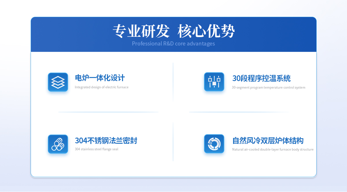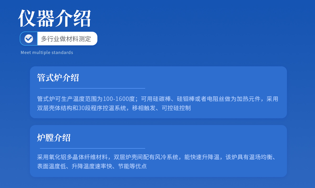| 1、爐膛采用優(yōu)質(zhì)氧化鋁纖維材料,保溫性能好,耐用,拉伸強度高,無雜球,純度高,節(jié)能效果明顯; | 2、加熱元件采用優(yōu)質(zhì)HRE電阻絲,大大提高了其使用壽命; | 3、超溫報警,漏電保護,操作安全可靠。 |