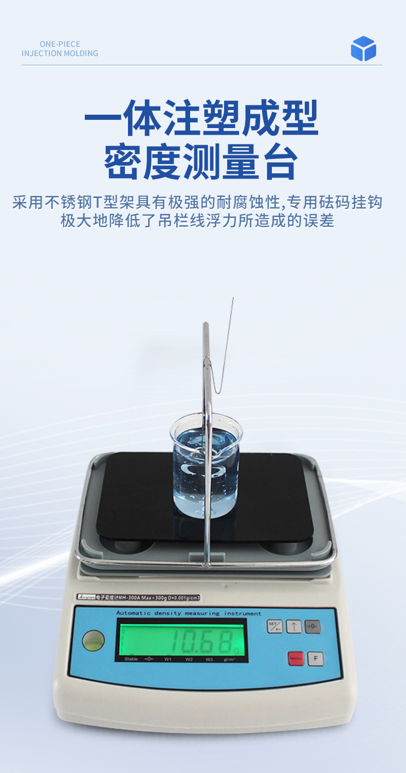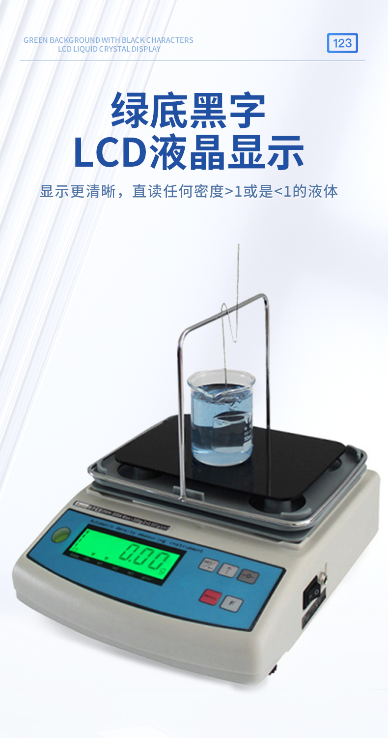 | 1、進入液體密度測試模式后,狀態(tài)顯示區(qū)顯示“AIR”。 將掛鉤懸掛在液體專用架正中央,按下“清零”鍵,扣除掛鉤重量。 | 2、使用掛鉤將標準的玻璃砝碼鉤起,穩(wěn)定后,按“取樣”鍵。確認玻璃砝碼在空氣中的重量時,顯示“SAV-A”,表示已記錄空氣中的重量值。 | 3、此時狀態(tài)顯示區(qū)顯示“LIq”。取下玻璃砝碼。并取50ml待測液體樣品到燒杯中,將玻璃砝碼放入液體中。 | 4、將燒杯放在支撐板的正中央,使用掛鉤將玻璃砝碼鉤起(確定測量液體有高于玻璃砝碼,而且玻璃砝碼不可以碰到燒杯壁),穩(wěn)定后,按“取樣”鍵。確認玻璃砝碼在液體中的重量時,顯示“SAV-B”,表示已記錄液體中的重量值。 | 5、自動顯示被測液體的密度值。按“模式”鍵,可切換顯示樣品的濃度值。 | 7、按“設置”鍵返回到待測狀態(tài),可進行下一組樣品的測量。(連續(xù)測試時,要將掛鉤及玻璃砝碼清潔干凈) | 儀器尺寸:195*220*190mm | 包裝尺寸:430*200*360mm | 包裝重量:4kg |